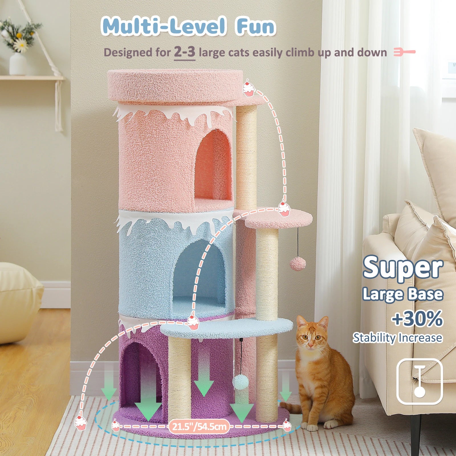 - With four levels and a height of 109 cm, this large indoor cat tree offers ample space for climbing and lounging, plus a stable 14.2 kg base in a Pink/Brown finish.